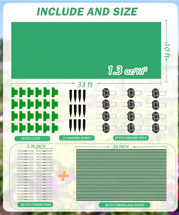 • 𝙎𝙪𝙥𝙚𝙧𝙞𝙤𝙧 𝙒𝙞𝙣𝙩𝙚𝙧 𝙋𝙡𝙖𝙣𝙩 𝙁𝙧𝙤𝙨𝙩 𝙋𝙧𝙤𝙩𝙚𝙘𝙩𝙞𝙤𝙣:This kit includes: 10×33-foot frost protection fabric, 36 garden arches, 36 connectors, 24 garden clips, 12 ground stakes, 12 support spikes, and an instruction manual. Designed to safeguard your vegetables, plants, crops, raised beds, and fruit trees from winter frost damage. All accessories can be mixed and matched to effectively combat winter frost and cold, while also preventing insect infestations and bird damage.