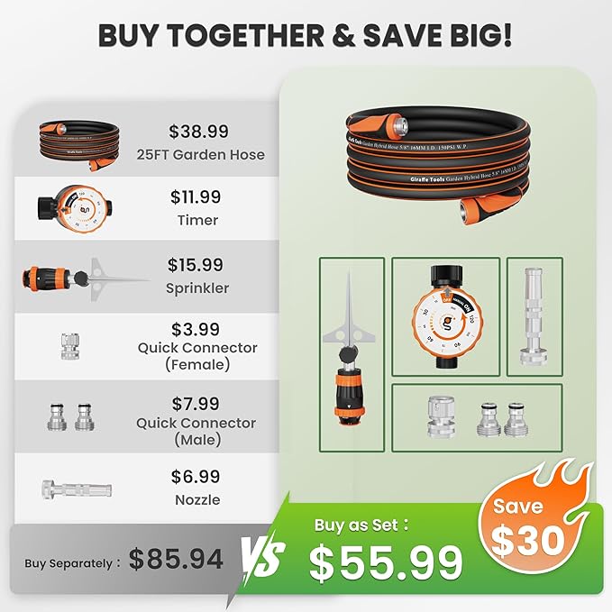 • Get the Hose Kit for Less Than Separately: Includes 25Ft 5/8" garden hose, spray nozzle, ground sprinkler, and 3/4" quick connect adapters - everything needed for effortless watering, car washing, and outdoor cleaning. Get everything you need for garden watering in one convenient set and save more than getting it individually.