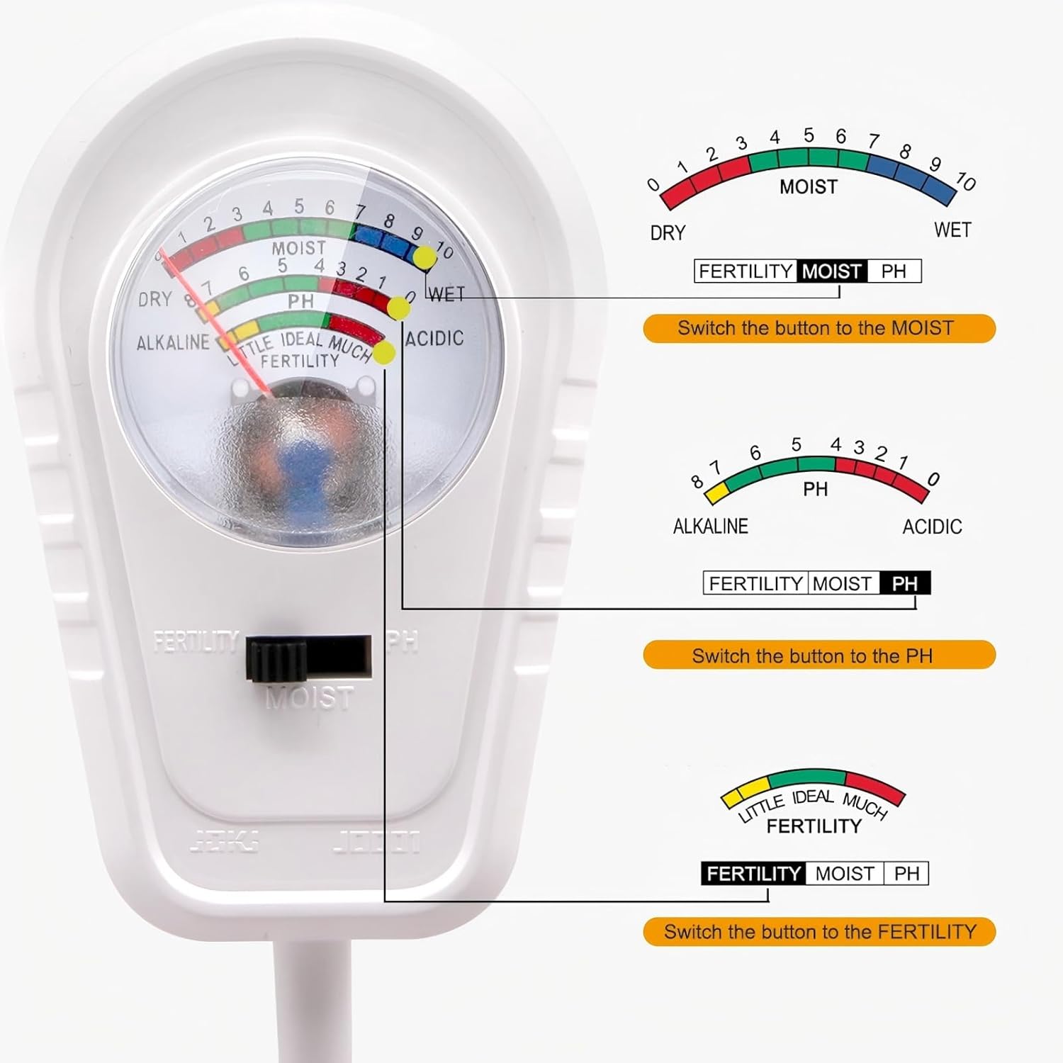 • 3 in-1 Soil Test Kit : This soil tester has upgraded functions, which can easily test soil moisture, soil PH and fertility to meet your different needs. Compared with traditional single-function soil moisture meter, our soil meter is more helpful in comprehensively diagnosing soil conditions, this allows for better control when applying water and fertilizer to plants.