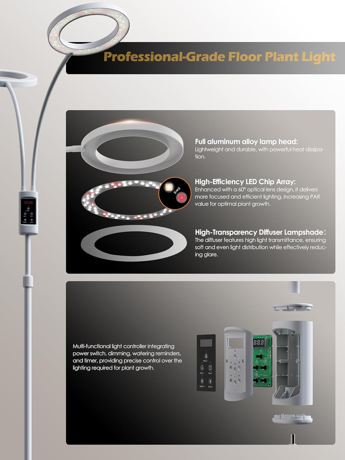 • 【Adjustable Height & Enlarged Lamp Head】LED Floor Grow Light G5 extends up to 70.87 inches, ideal for plants of various heights. The enlarged lamp head and 360° flexible gooseneck allow broader light coverage and precise angle adjustments, ensuring efficient and customized lighting.