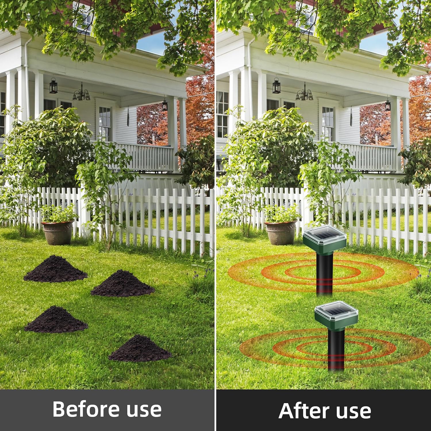 • Powerful & Effecive Solar Mole Repellent: Harnessing solar energy, these mole repellent stakes emit powerful ultrasonic waves to drive away moles, gophers, voles, groundhogs, chipmunks and even snakes. No traps or death—just a humane solution to protect your lawn garden farm yard