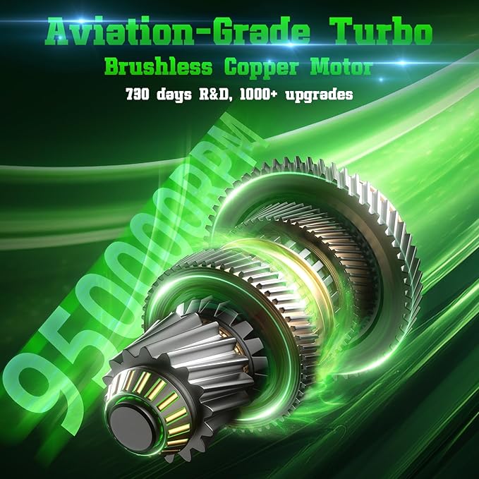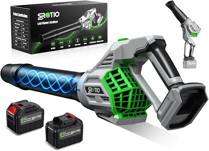 - 【Upgraded Brushless Turbo Motor Technology】SROTIO Leaf Blower features advanced turbine air duct technology and a 12-blade axial fan design, reducing wind resistance and increasing air pressure by 40%. This leaf blower cordless delivers high RPM and powerful performance for maximum airflow. cordless leaf blower offers 4 speed settings: Normal mode reaches up to 160 mph(3 speeds)and Turbo mode reaches up to 250 mph. This lawn care blowers for lawn care will boost your cleaning efficiency.