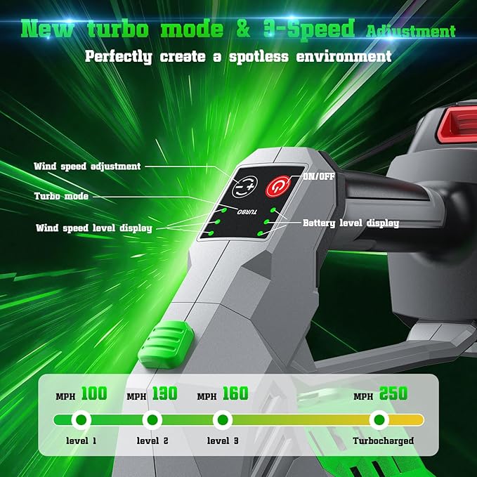 - 【3-Speed Ddjustment & Storm Mode】lawn care blowers feature 3 speed settings and a storm mode, providing true progressive control. cordless leaf blowers easily switch between modes to remove dust, dry debris, fallen leaves, and snow, effectively improving cleaning efficiency and saving time. hand held blower One-touch control ensures effortless operation, allowing you to easily adjust the air volume to suit different work scenarios and minimize power consumption.