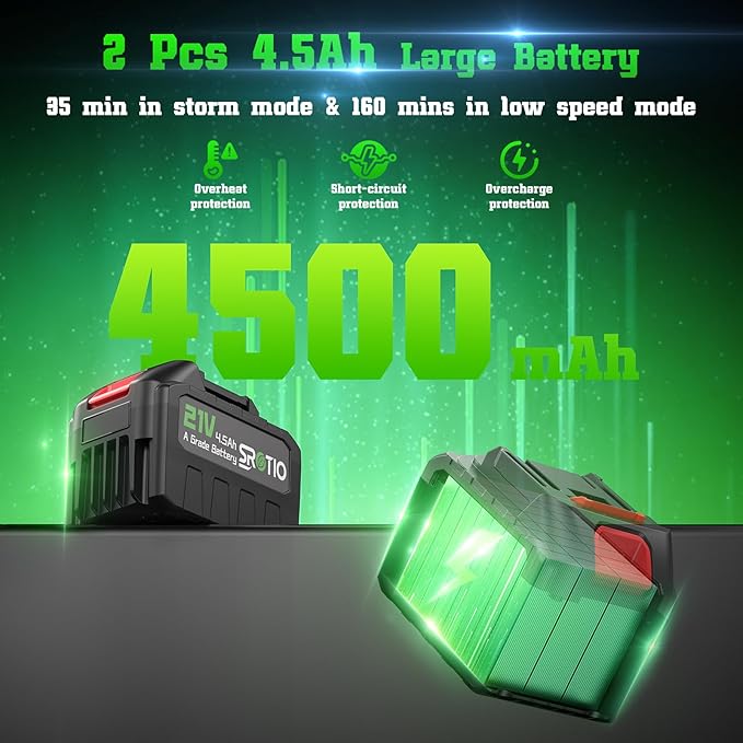 - 【Electric Leaf Blower - Dual Battery Life】Leaf blower have upgraded large-capacity batteries, equipped with two 21V-4.5Ah batteries and a fast charger. The battery life in low-speed mode is 120 minutes, the battery life in high-speed mode is 60 minutes, and the battery life in storm mode is 35 minutes. leaf blowers it can be fully charged in 5-6 hours(The due to the large battery capacity, charging takes longer. charging indicator light turns red when charging and green when fully charged.)