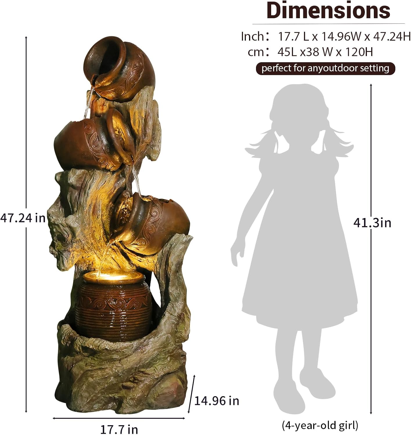 • Versatile Size (18.5”×16.14”×47.24”) for Backyard & Indoor Use This backyard fountain’s compact yet tall design fits perfectly in gardens, backyards, or even indoor sunrooms. A stylish water feature for any space.