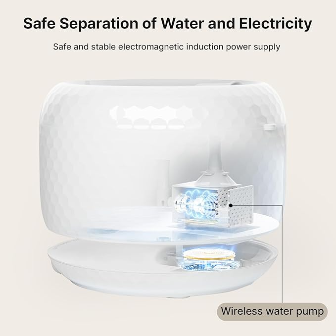 - 100% Water-Separated Safety: Our cat fountain utilizes safe electromagnetic induction technology to power the pump wirelessly. This completely separates electricity from water, ensuring a reliably secure and worry-free operation for you and your pet.