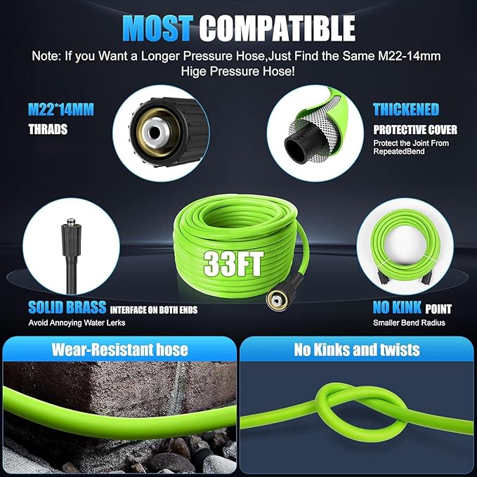 • 33ft Hose + 33ft Cord: Reach Every Corner: No More Tripping Over Limits. A 33ft high-pressure hose and 33ft power cord let you clean two-story homes, large driveways, or backyard patios without moving the unit. Please remember to empty the air in the hose before use, otherwise the pressure of the washing machine will not reach the standard.