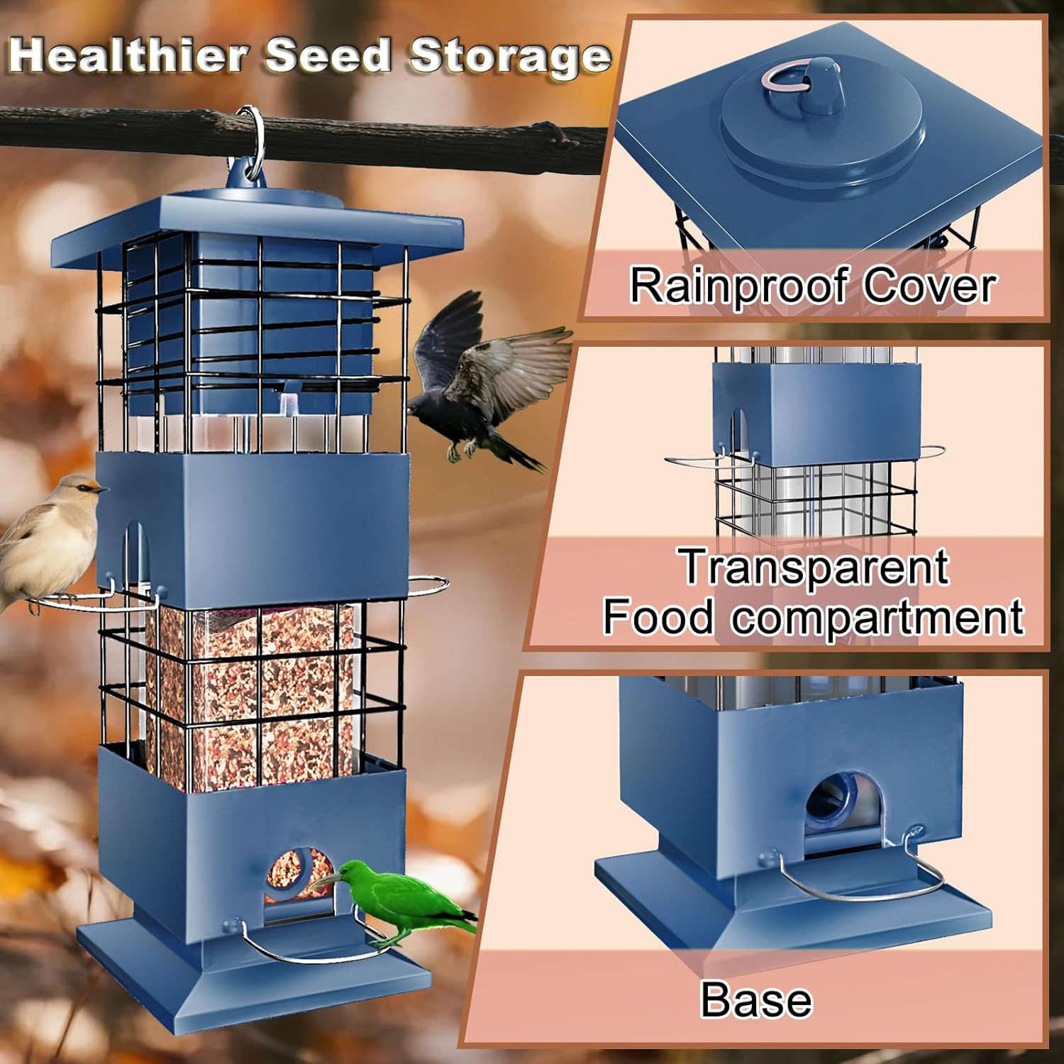 • Easy to Use Wild Bird Feeders: The clear plastic material seed tube of the anti squirrel birdfeeder can holds up to 2.5 lbs seeds, you to monitor seed sufficiency at all times. And the detachable roof and large opening make the hanging bird feeder easy to fill birdseeds and easy to clean, also keeps seeds as dry as possible, allow birds to eat fresh food. Our bird feeder squirrel proof is suitable for all weathers.