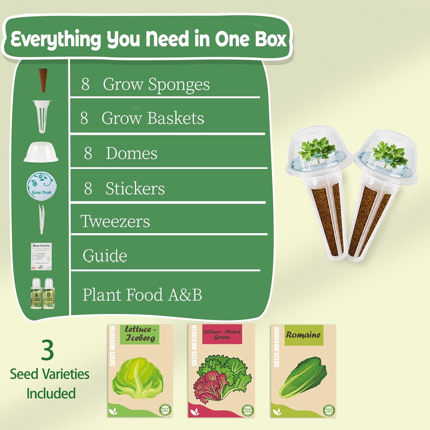 • Complete & Affordable Kit: Each 38-piece kit includes: 200ml AB Plant Food, 8 Grow Sponges, 8 Grow Baskets, 8 Pod Labels, 8 Grow Domes, 1 Tweezers, and 3 Seed Packets. Everything you need in one set.