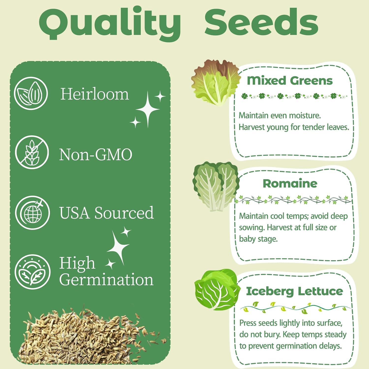 • High Germination Rate: This kit includes three types of lettuce seeds: Romaine, Iceberg Lettuce, and Mixed Greens. Enjoy a plentiful harvest with our high-quality seed pods that boast excellent germination. All fresh, reliable seeds sourced from USA ensure quick sprouting and healthy growth.