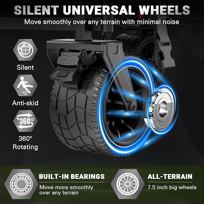 • [All-Terrain 360°Silent Swivel Wheels]Glide smoothly over sand, gravel, grass, or uneven pavement with premium noiseless wheels. The 360-degree rotation provides effortless maneuverability, while the rugged tread design ensures stability on any surface