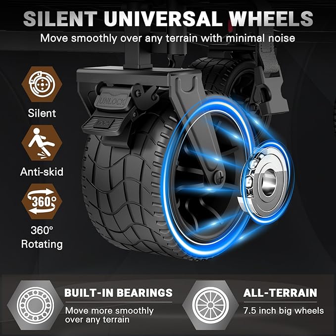 • [All-Terrain 360°Silent Swivel Wheels]Glide smoothly over sand, gravel, grass, or uneven pavement with premium noiseless wheels. The 360-degree rotation provides effortless maneuverability, while the rugged tread design ensures stability on any surface