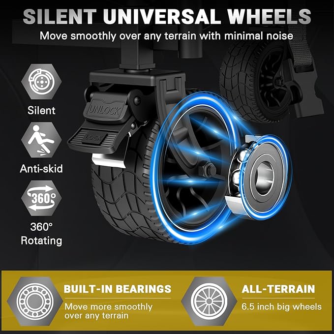 • [All-Terrain 360°Silent Swivel Wheels]Glide smoothly over sand, gravel, grass, or uneven pavement with premium noiseless wheels. The 360-degree rotation provides effortless maneuverability, while the rugged tread design ensures stability on any surface.