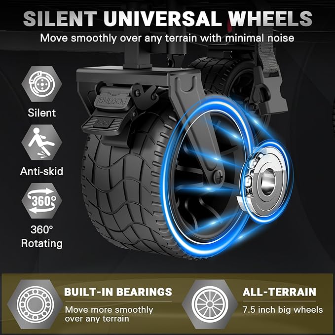 • [All-Terrain 360°Silent Swivel Wheels]Glide smoothly over sand, gravel, grass, or uneven pavement with premium noiseless wheels. The 360-degree rotation provides effortless maneuverability, while the rugged tread design ensures stability on any surface