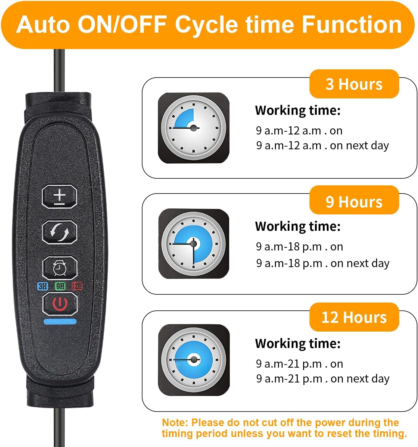 • 【Auto On/Off & Timing Function】The plant grow light comes with a cycle memory timer function, which can Auto turn on/off every day according to your settings: 3/9/12 hours, the grow light will Auto turn on and off at the same time the next day, no manual operation is required, it can take care of your plants when you on work or vacation.