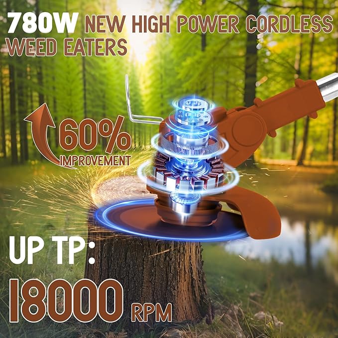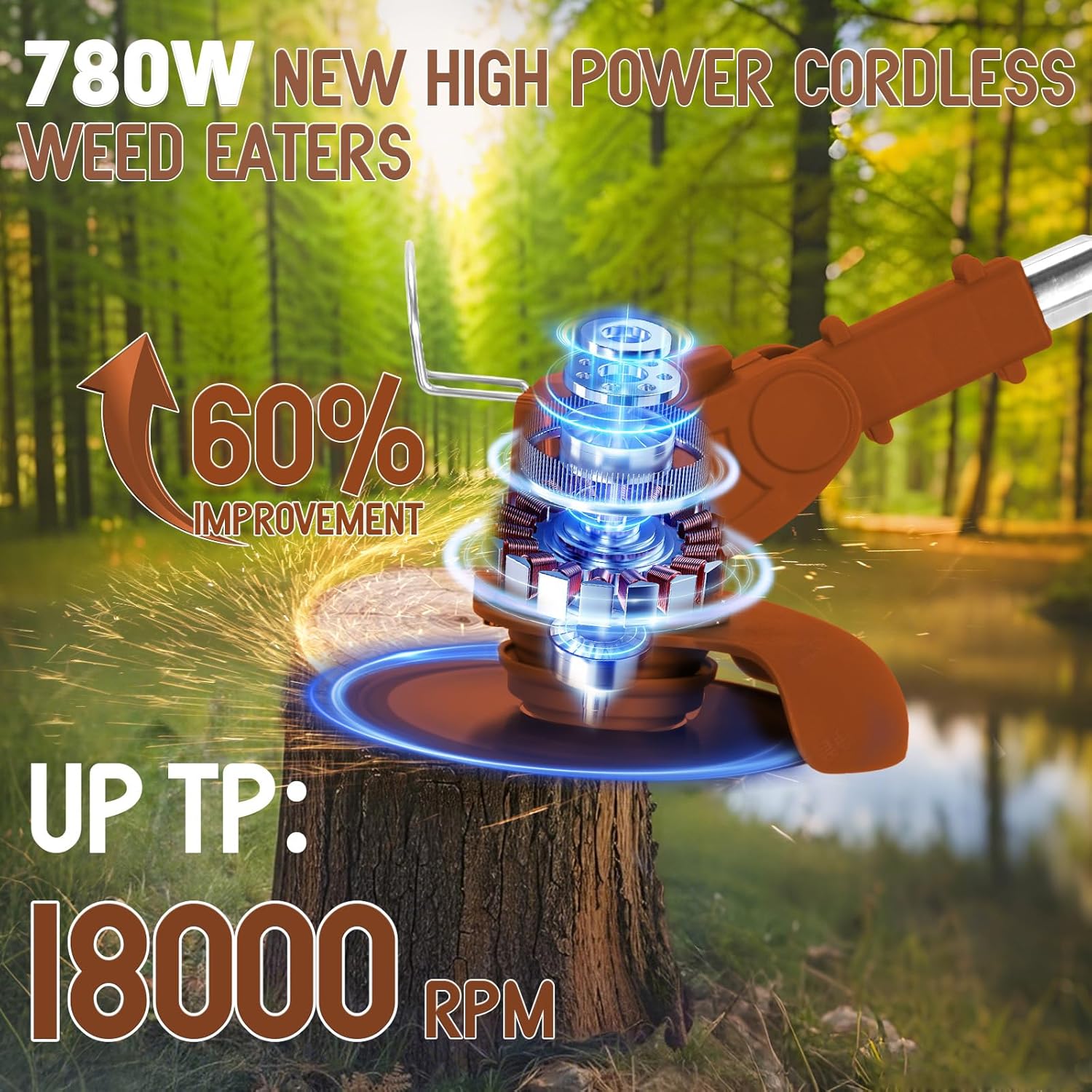 • [Powerful Performance]With an 18,000 RPM motor and 305mm cutting width, this electric weed wacker cordless slices through thick grass and weeds like a pro. Outperforms gas trimmers—quiet, eco-friendly, and zero maintenance!