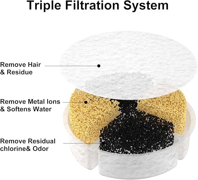 • 4-Stage Filtration Technology: Equipped with a multi-layer filtration system—including high-density cotton, coconut shell, activated carbon, and ion-exchange resin—it effectively removes odors, softens water, and ensures cleaner, fresher drinking water for your pets.