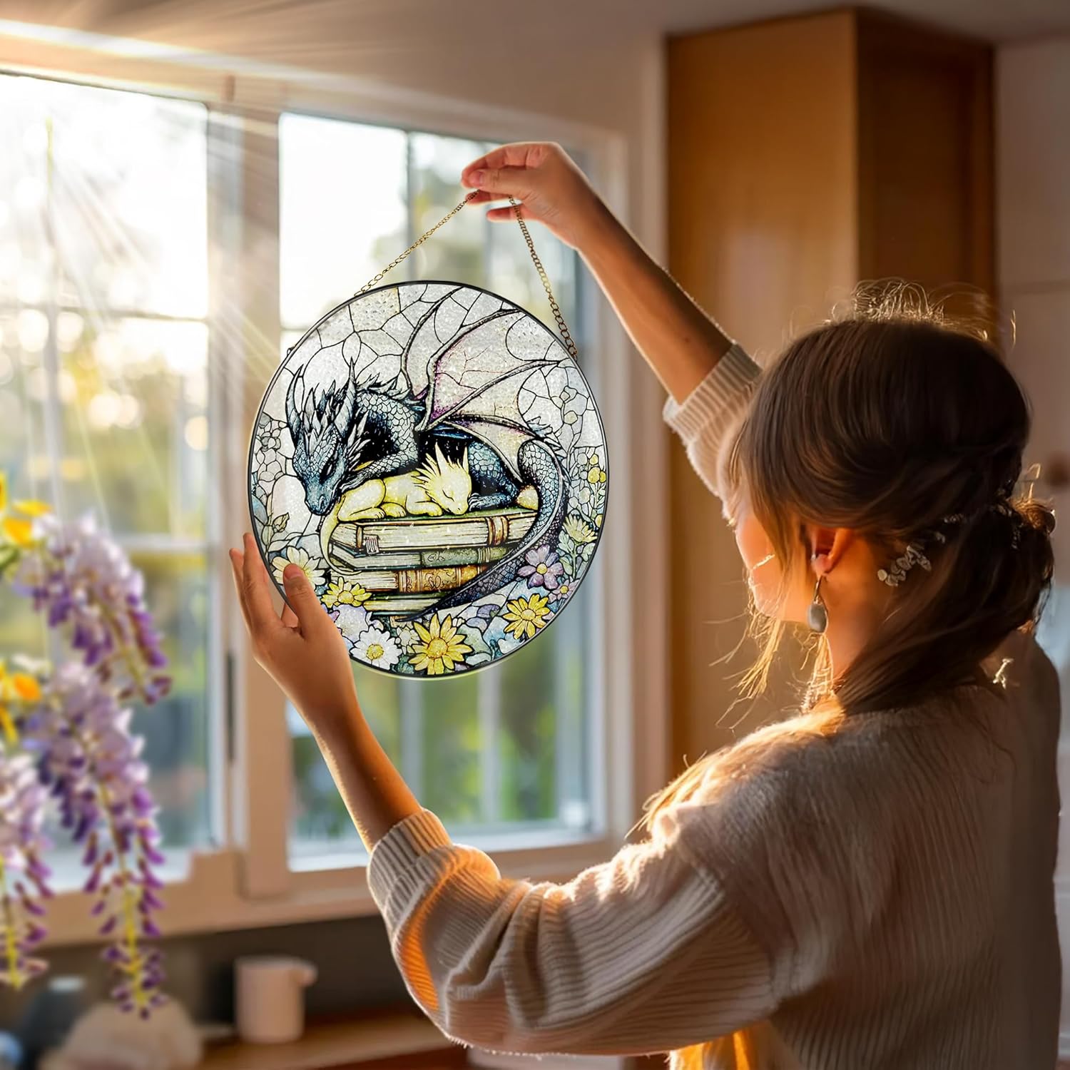 Stained Glass Window Hanging, 8 Inch Dragon Stained Glass Suncatcher, Dragon Decor, Home Decor for Windows, Book Lover Gift, Gifts for Book Lovers, Gifts for Bookworm on Birthday Christmas