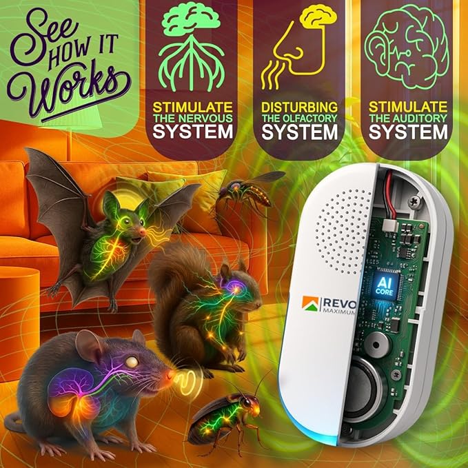 • AI-Tuned Ultrasonic Tech (20–65 kHz): Auto-cycling sound waves disrupt pests’ nervous, auditory and olfactory systems to help repel rodents, bats and insects. Just plug it into any outlet.