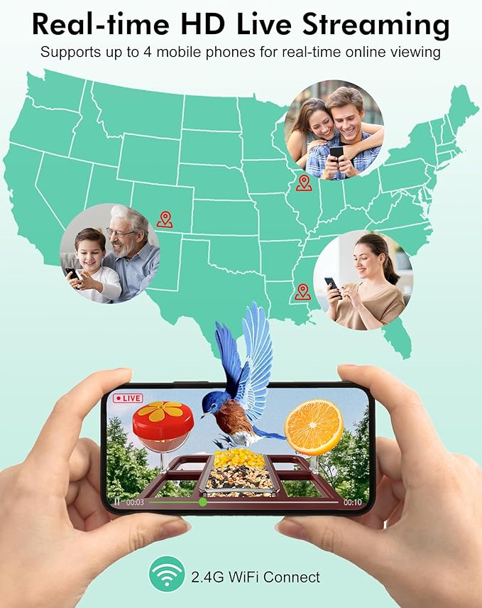 - 【Dual Storage Modes|Cloud + Memory Card】 The Bird Feeder Camera automatically saves recorded videos and photos to the cloud or the inserted memory card (comes with a 32GB card, and the maximum supported is 128GB). The pre-installed 32GB memory card can store over 20,000 video clips of 10-second duration; meanwhile, the camera supports real-time HD live streaming for up to 4 mobile phones simultaneously, allowing you to share every wonderful moment with family and friends anytime.