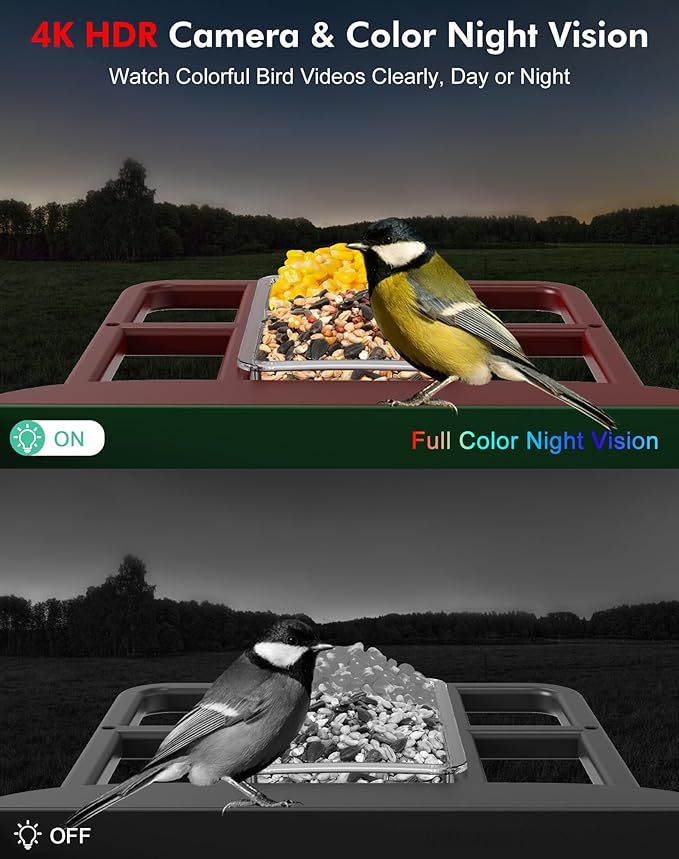 - 【4K HDR Night Vision Camera】This bird feeder features a 140° ultra-wide viewing anglecombined with a true 4K HDR high-definition lens,capturing clear images and videos even in low-light conditions.With PIR motion-activated detection at 0.01-second responsiveness,it comprehensively captures vivid avian details across broad areas.