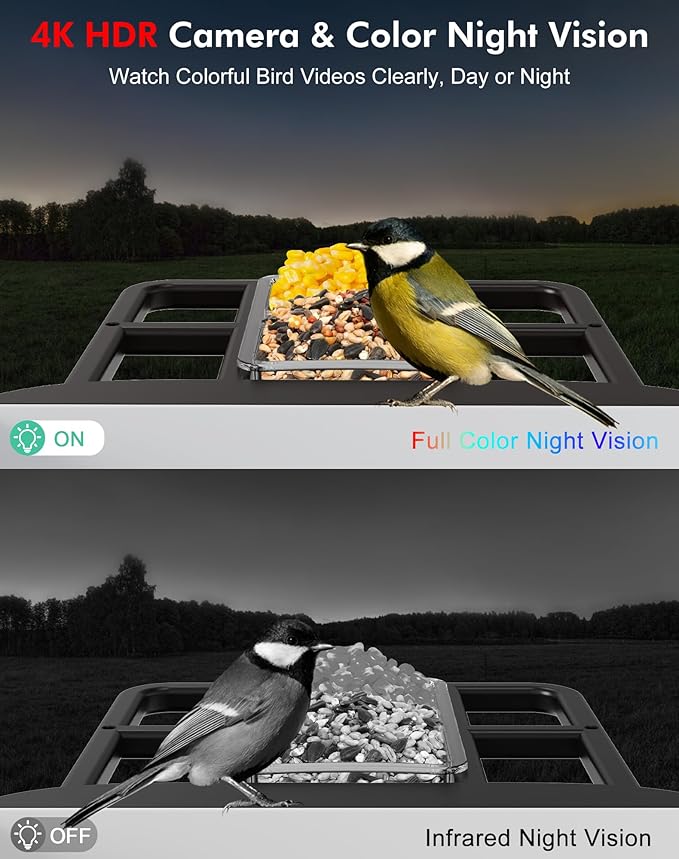 - 【4K HDR Night Vision Camera】This bird feeder features a 140° ultra-wide viewing anglecombined with a true 4K HDR high-definition lens,capturing clear images and videos even in low-light conditions.With PIR motion-activated detection at 0.01-second responsiveness,it comprehensively captures vivid avian details across broad areas.