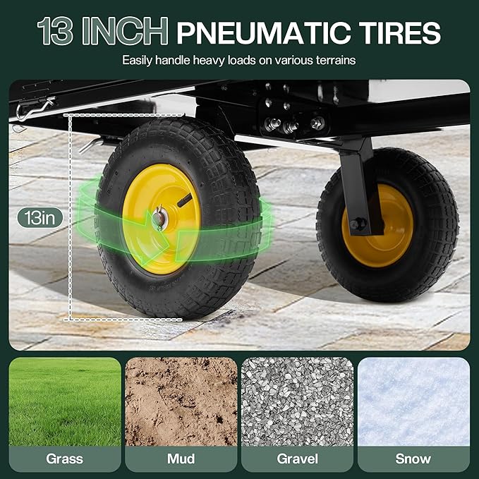 • 13" Pneumatic All-Terrain Tires: Equipped with 13-inch air-filled tires, this dump trailer glides over grass, gravel, mud, or snow with shock-absorbing stability and less fatigue