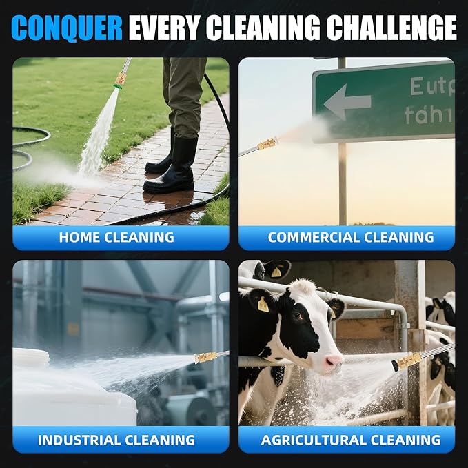 • ๐‚๐จ๐ฆ๐ฉ๐ซ๐ž๐ก๐ž๐ง๐ฌ๐ข๐ฏ๐ž ๐‚๐ฅ๐ž๐š๐ง๐ข๐ง๐  - This pressure washer has 4 quick-connect nozzle heads (0ยฐ, 25ยฐ, 40ยฐ, and soap) ranging from high-impact water jets to soft dispersion, perfect for cleaning decks, cars, house exteriors, outdoor furniture, and preparing your house exterior for painting. It can effectively remove dirt and grime from any surface in a short time.