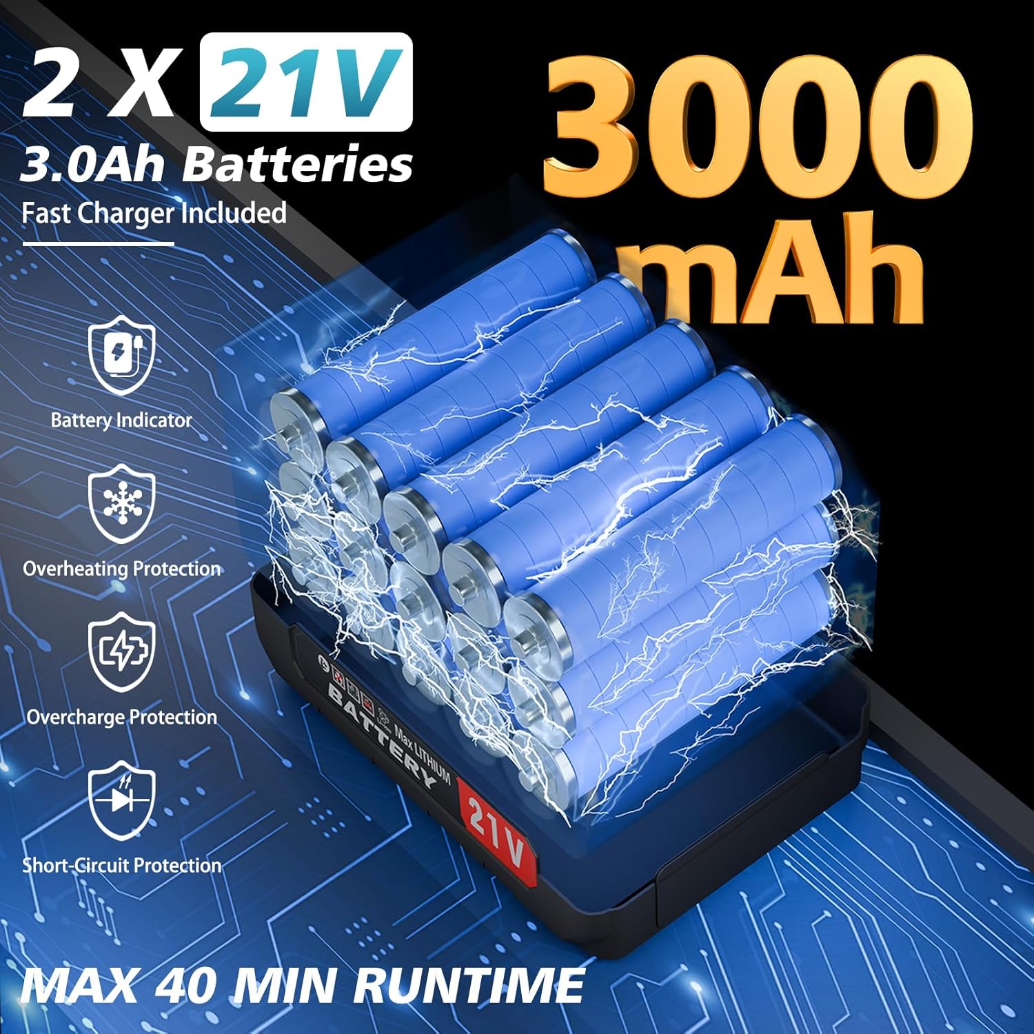 • 2 x 3.0Ah Batteries for Extended Runtime:Enjoy double the power with two 21V 3.0Ah lithium batteries—no downtime for charging! The real-time battery indicator keeps you informed, and each battery provides longer runtime, ensuring uninterrupted cleaning for larger yards or multiple tasks