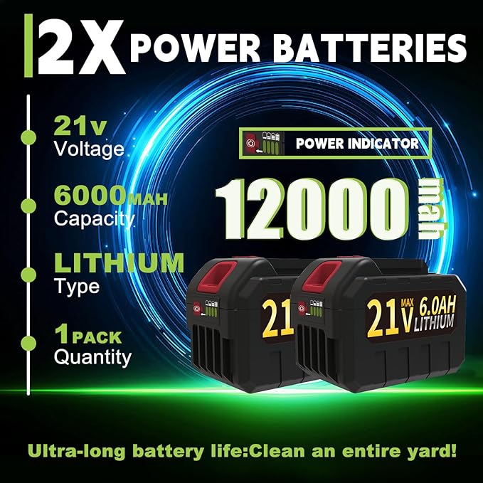• 【Long-Lasting 6.0Ah Battery with LED Power Display】This leaf blower cordless with battery and charger comes with a powerful 6.0Ah lithium battery that easily supports full-yard cleaning on a single charge. The built-in LED display shows real-time battery status, allowing you to manage power efficiently and work smarter for longer. For best performance, please fully charge the battery before first use, and allow it to rest for 5–10 minutes after discharge before recharging.
