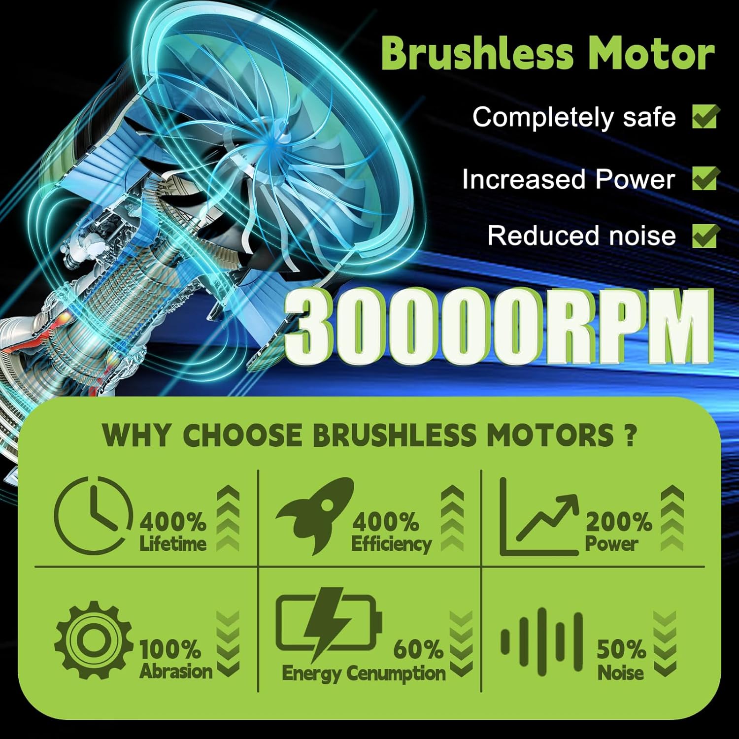 • 【Powerful Brushless Motor & Strong Airflow】This cordless leaf blower features a high-efficiency brushless motor, delivering superior airflow and longer lifespan while reducing energy loss. With 6 adjustable speed modes, it easily handles different cleaning scenarios—from dry leaves to snow or small gravel—making it a powerful upgrade over ordinary electric leaf blower models.