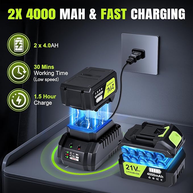 • 【Upgraded 2 x 4.0Ah Batteries & Fast Charger】Power through bigger jobs with our electric leaf blower,now including two 4.0Ah high capacity batteries and fast charger.Each battery delivers up to 30 minutes of runtime (low speed),the fast charger only takes 1 hour to fully charged. Never stop working-swap batteries for non-stop power