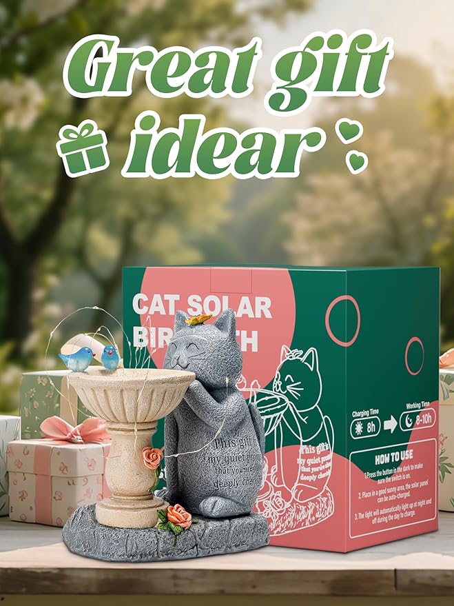 • Easy to Use: Simply switch the cat statue to the “ON” position and place it where it can receive sunlight during the day. The built-in solar panel will absorb energy and automatically illuminate the LED flower at night. A full charge takes about 6–8 hours of daylight and provides 8–10 hours of warm, ambient light after dark.