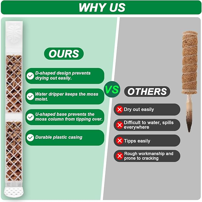 • [Sturdy Moss Poles for Indoor Plants]: Our meticulously crafted Moss Pole Kit features 4 psc 9-inch D-shaped moss pole sequipped with a water dripper and an anti-dumping base..Designed to grow with your plants, the poles extend vertically as needed while providing sturdy support for climbing varieties like Monsteras, Philodendrons, and other vining species. Ideal for both beginners and seasoned plant parents, this all-in-one set helps you effortlessly create that lush indoor jungle vibe.