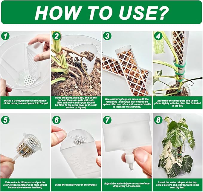 • [Assembly and Usage Tips]: Attach the moss stem to the desired height for your plant. Install the U-shaped base at the bottom, add moss, and install the dripper at the top. Place the container of slow-release fertilizer into the dripper. A U-shaped base is recommended; a plug-in base is an alternative. When using a U-shaped base, remove the plant from the pot, install the moss stem, fill it with moss, and place it in the pot. Repot the plant and secure it to the stem with gardening ties.