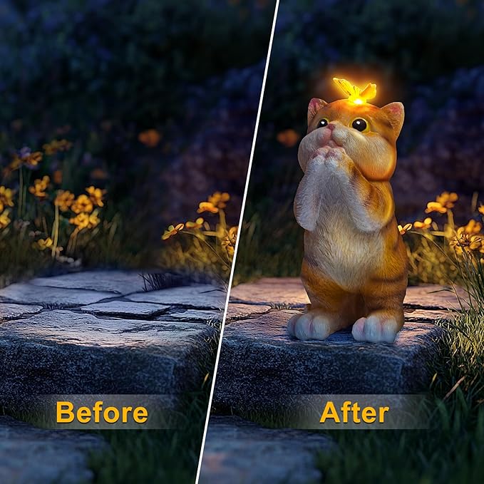 • 【Exquisite Solar Garden Statue】--Equipped with a high-efficiency solar panel, this cat garden statue decor charges effortlessly in 6-8 hours of sunlight and provides continuous lighting for 8-10 hours each night.