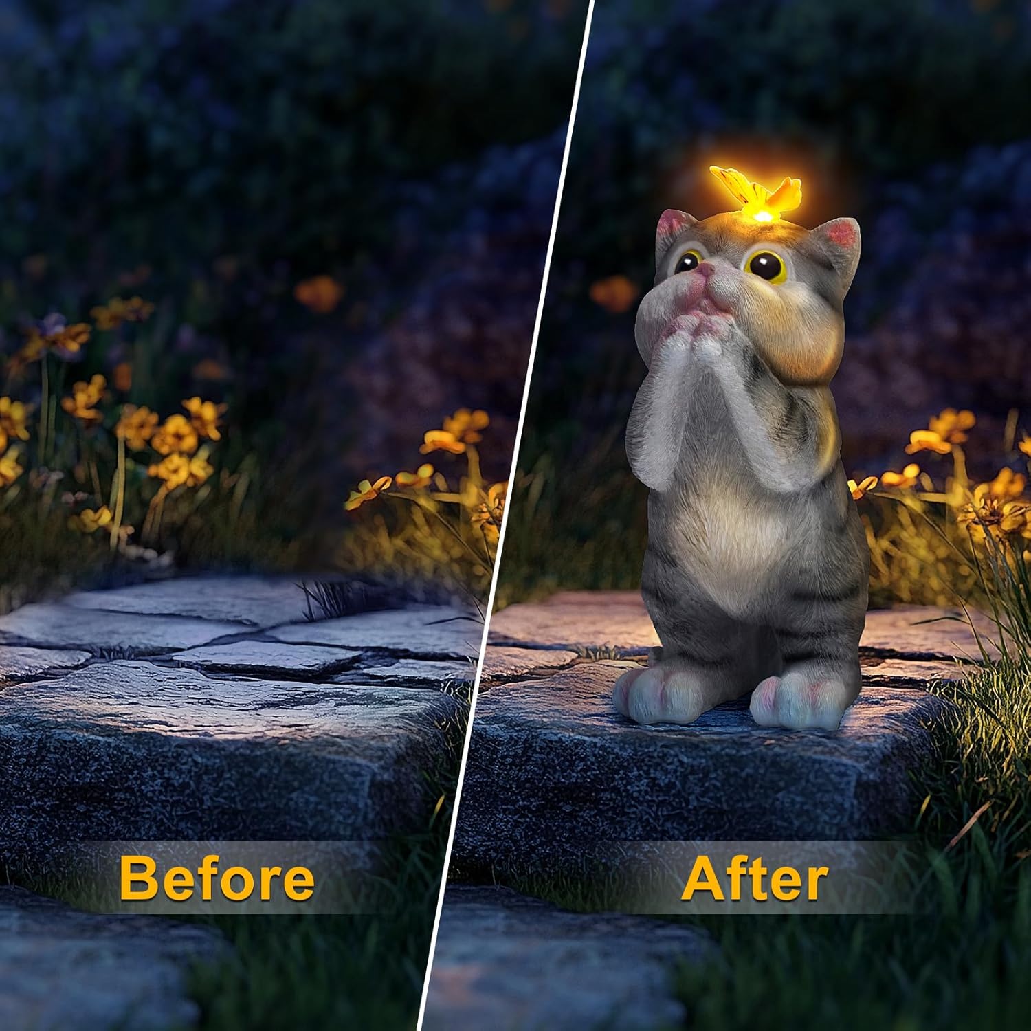 • 【Exquisite Solar Garden Statue】--Equipped with a high-efficiency solar panel, this cat garden statue decor charges effortlessly in 6-8 hours of sunlight and provides continuous lighting for 8-10 hours each night.