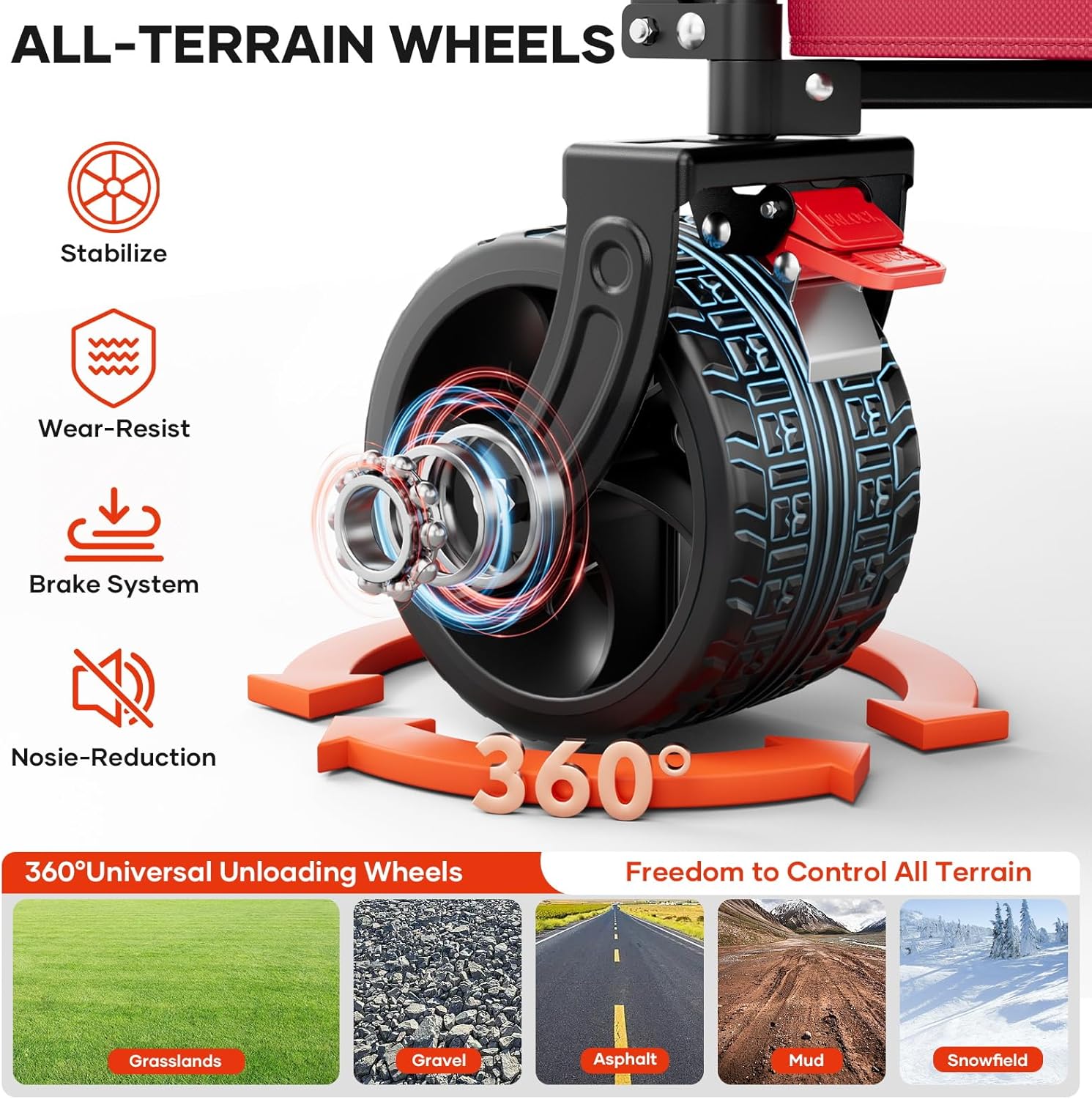 - All Terrain Big Wheels: Equipped with upgraded all-terrain wheels, our collapsible wagon cart glides smoothly over sand, grass, gravel, and uneven ground. The wide wheels with deep treads prevent sinking and make it the perfect companion for beach days, garden parties, or outdoor adventures.