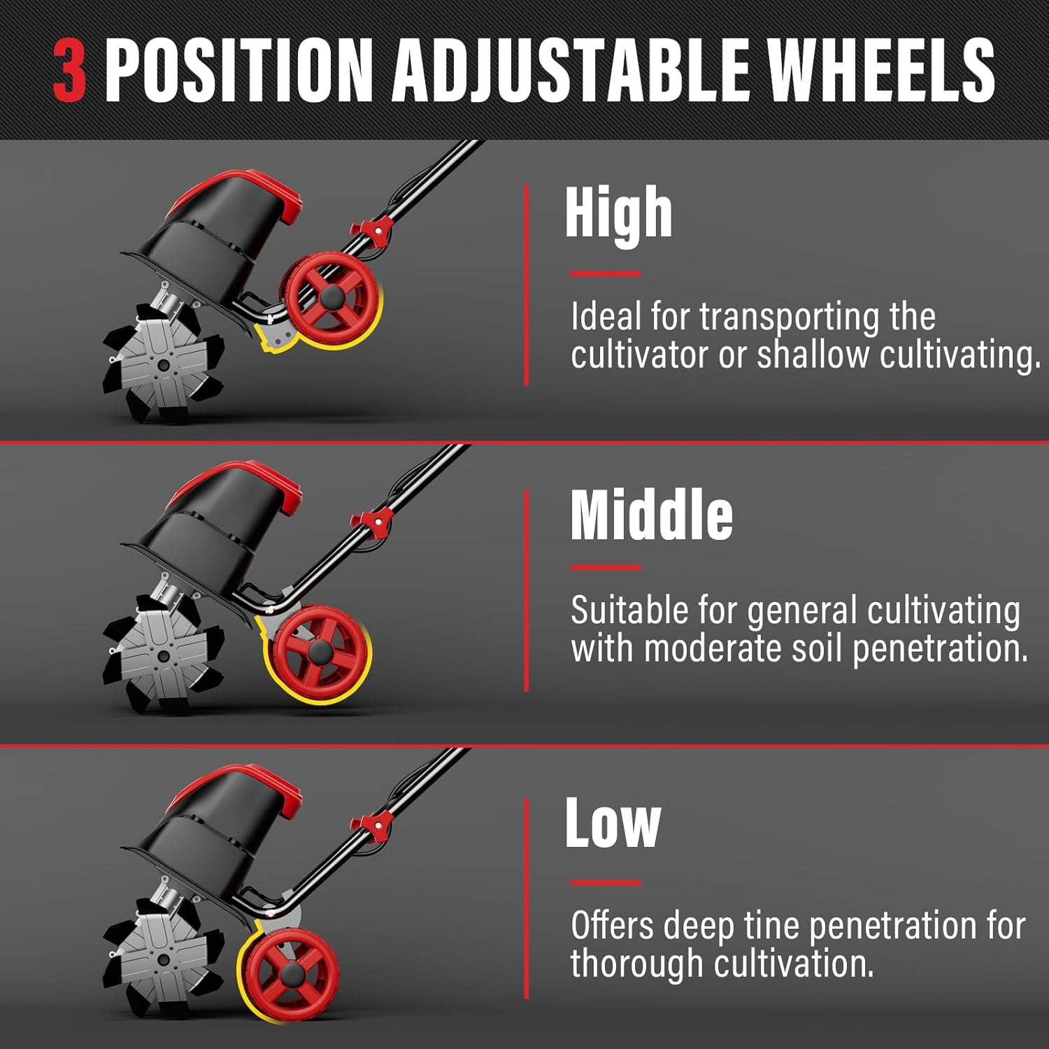 • [Adjustable Wheels for Versatility]:MZK cultivator comes with adjustable wheels and three height settings, allowing you to easily switch between different tasks. Whether you're maintaining soil or planting seeds, you can customize the depth for better control and performance.