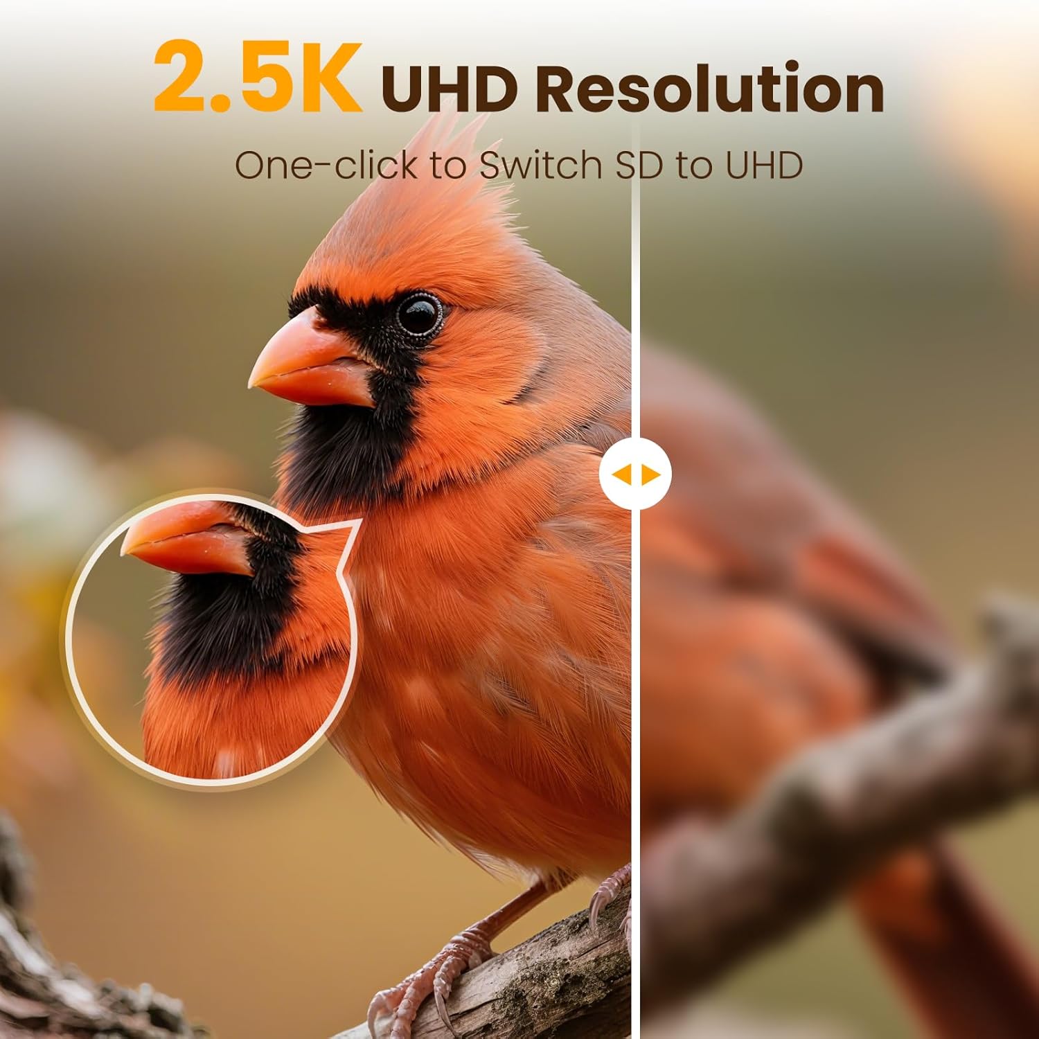 - Immersive 2.5K HD Bird Video. Discover a whole new way of bird watching with bird feeder camera! Enjoy crystal-clear 2.5K high-definition views of the birds, revealing every detail of their beautiful plumage. The 130° adjustable vertical angle lets you choose the perfect viewing angle for an unobstructed look at the feeding area. Even at night, the colorful night vision keeps your bird watching adventures going. You also can listen to the birds with the two-way audio as if you were right there.
