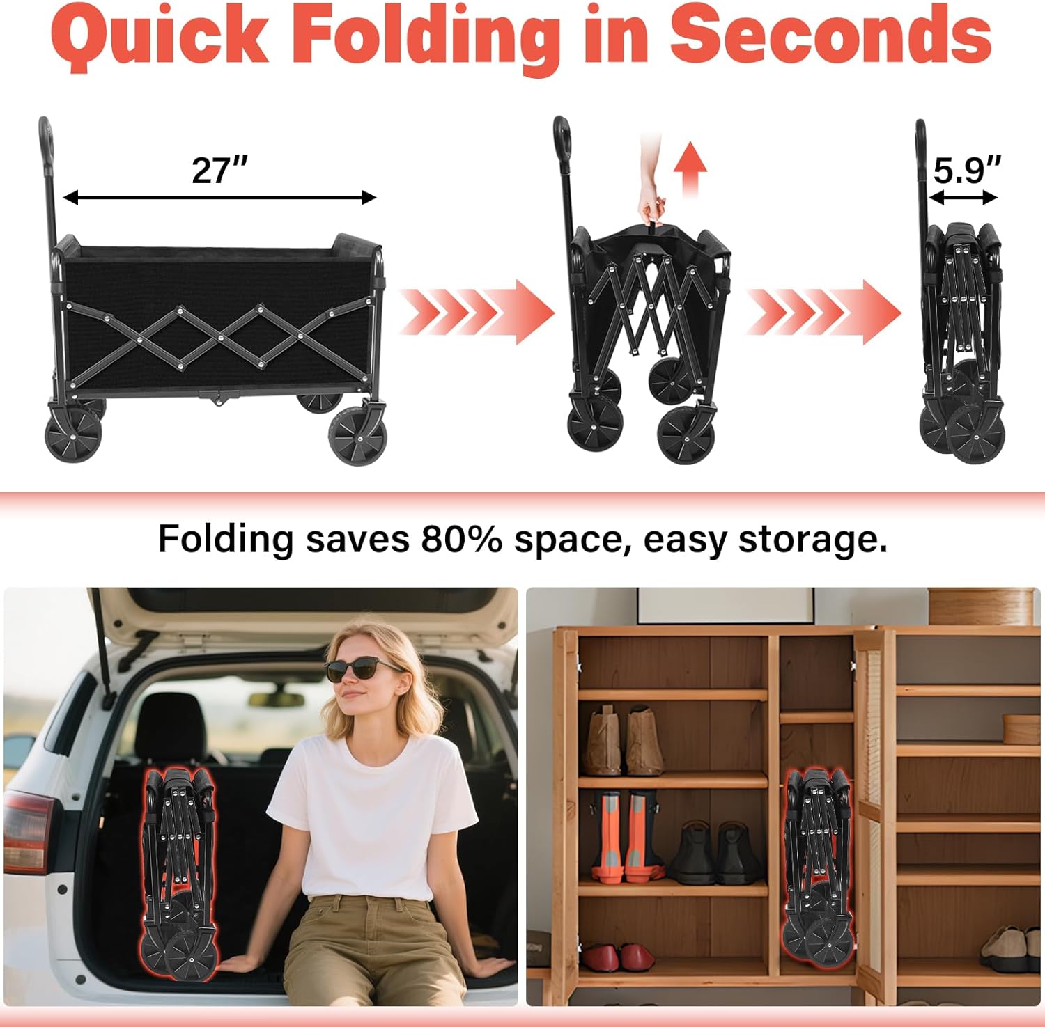 • Instant Setup & One-Touch Fold: Easy assembly—just snap on all four wheels and secure the wagon cart handle. To fold, lift the bottom strap for automatic collapsing. The ultimate fold-up wagon for on-the-go living.
