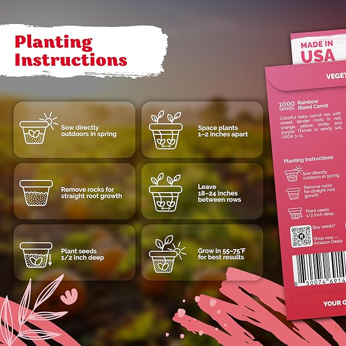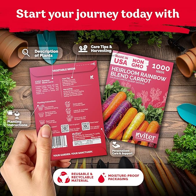 • Vibrant Colors: Red, purple, white, yellow & orange rainbow carrots; 90%+ germination rate. Rainbow carrot seeds for planting thrive in USDA 3‑11, ideal for growing organic carrots fresh for juicing & fresh snacks.