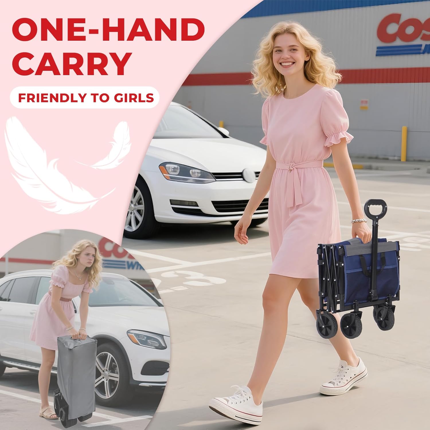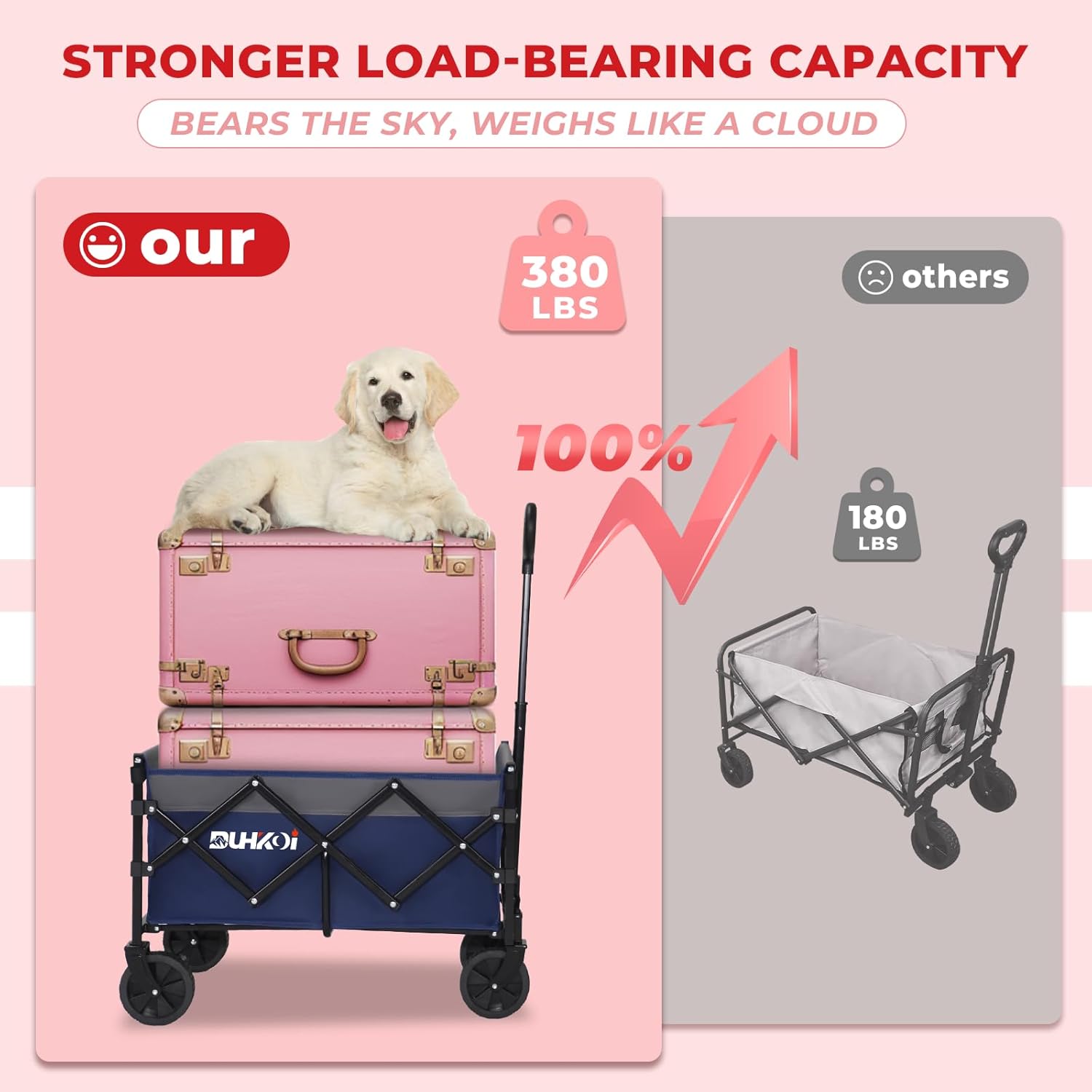 - We Heard You:Meet the ultra‑light Portable DUHKOI folding wagon—just 11 lbs, lighter than a small dog and friendly to every girl out there. One hand lifts it, no sweat, no strain. Say goodbye to sore backs and hello to the prettiest, easiest version of you—anywhere, anytime