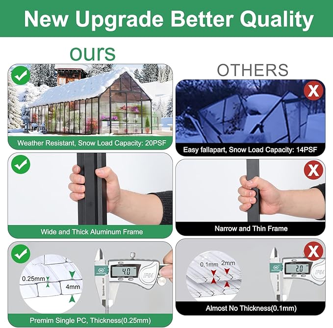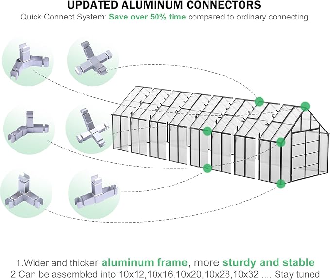 • Sturdy Frame: Our greenhouse kit boasts a robust rust-resistant aluminum frame designed to withstand various weather conditions. Introducing patented technology, Easy assembly, saving you 50% of your time. Gone are the days of tedious setups. With a simple push and locking screw, our Quick Connect ensures a reliable, secure, and swift link-up. It can also support snow loads of up to 20PSF.