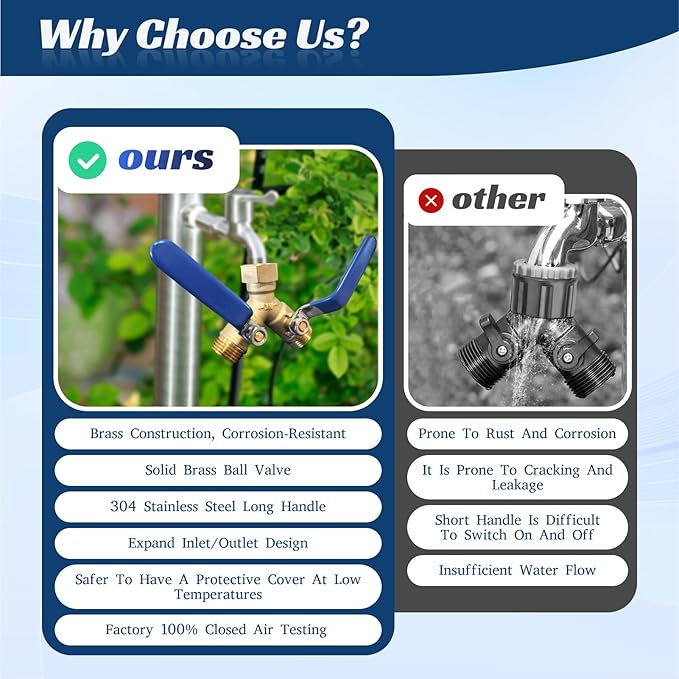 • Super durability:Adopting high-quality solid brass valve body and 304 stainless steel handle, it is rust resistant, corrosion-resistant, and durable. Equipped with an additional faucet protective cover, it can prevent freezing and cracking in winter, ensuring worry free use throughout the year.
