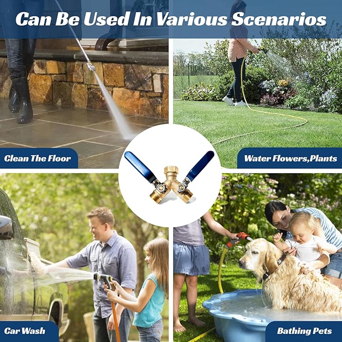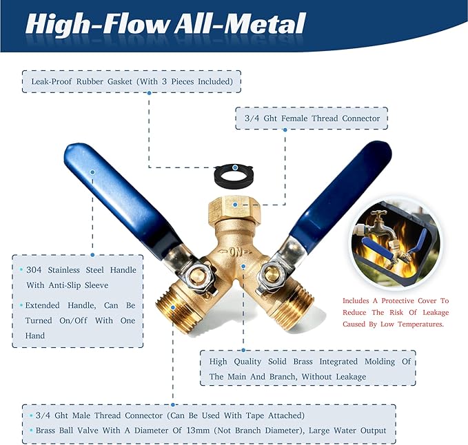 Garden Hose Splitter 2 Way Heavy Duty Brass Hose Splitter With 304 Stainless Steel Long Handle & Winter Faucet Protector, 3/4" Y Valve Thread High Flow Outdoor Faucet Splitter