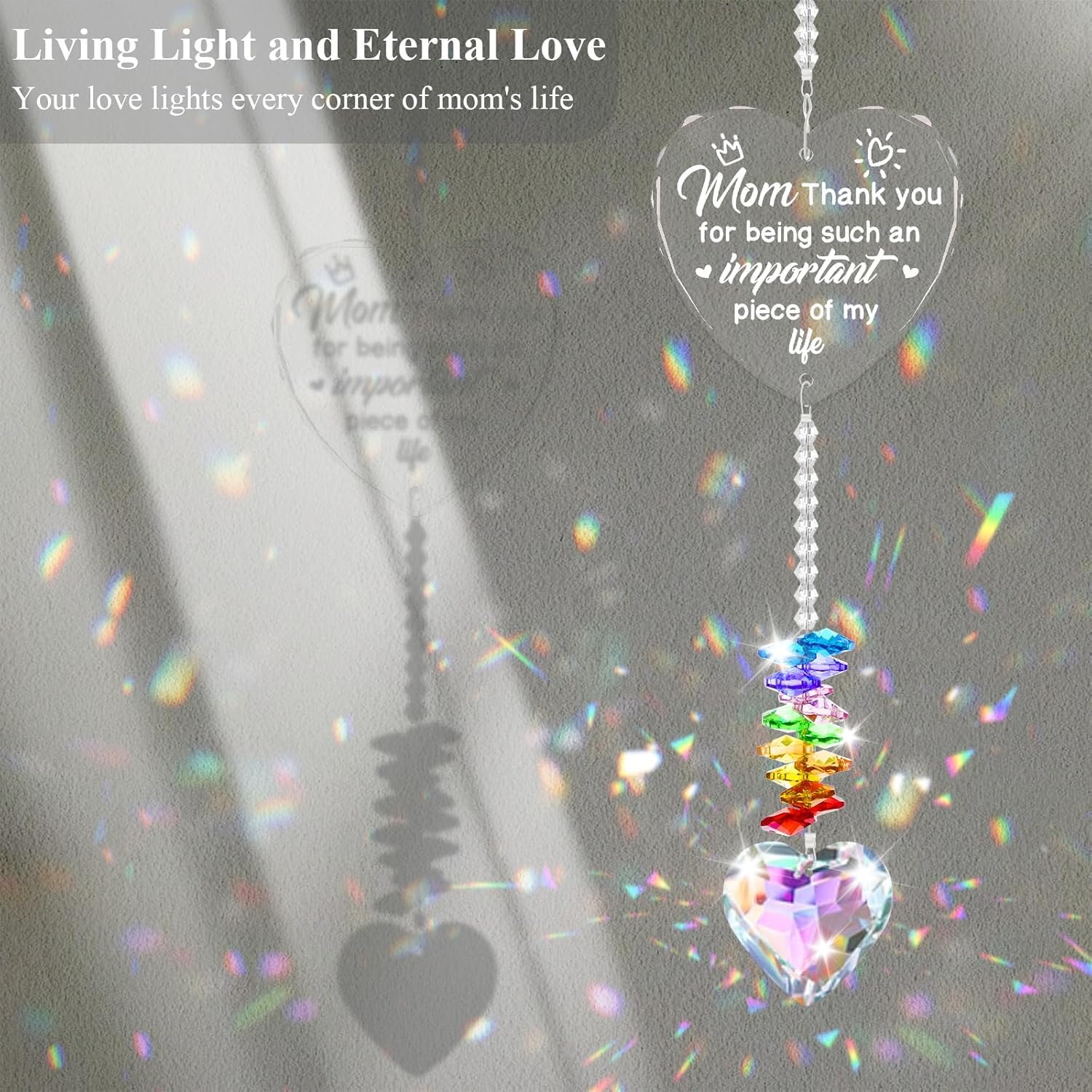 • Meaningful Mom Crystal Suncatcher: This gleaming suncatcher, crafted with premium, precision-cut K9 colored crystals, shines bright. Its heart-shaped crystal prism dangles from a chain—vibrant, glittering, and centered with a colorful stone that mirrors the hope of a rainbow. The loving crystal is engraved with: Mom, thank you for being such an important piece of my life.