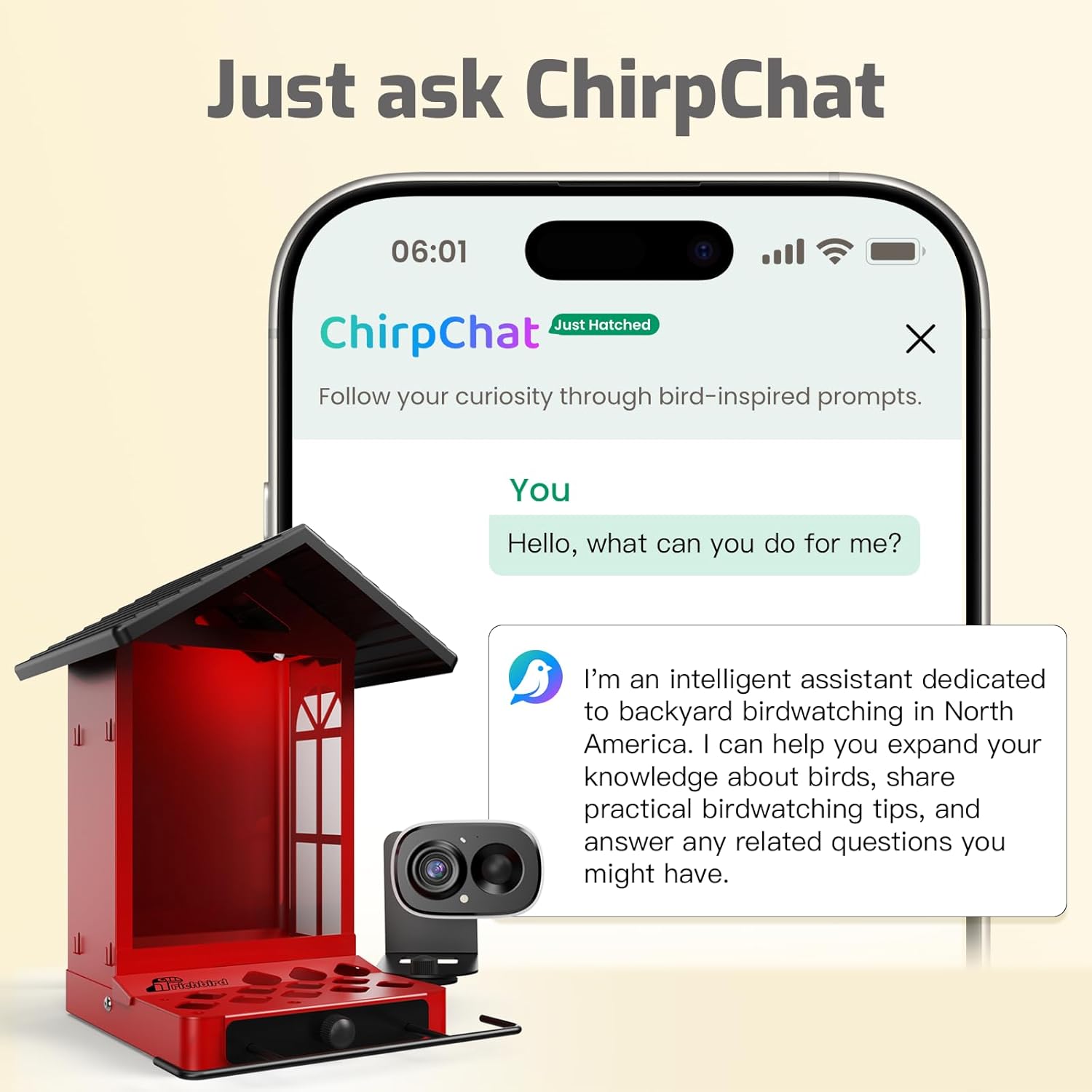 • Talk to an AI Bird Expert - Discover the story behind every visitor with our revolutionary ChirpChat feature. When a new bird arrives, simply ask the AI questions like, "What kind of bird is this?" or "What are its migration patterns?" You'll get instant, detailed answers, turning every sighting into a fascinating learning experience for the whole family