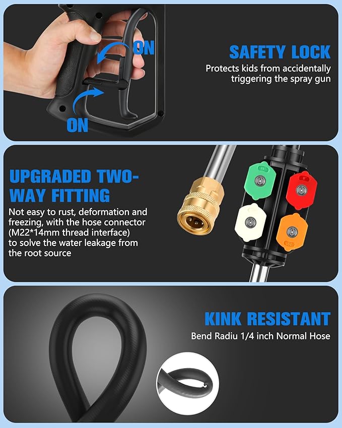 • Versatile Cleaning Solutions: Comes with 4 quick-connect nozzles (0°, 15°, 25°, 40°) and a foam cannon for creating rich, cleansing foam. Perfect for a variety of surfaces, from cars to windows, ensuring effective and easy cleaning.