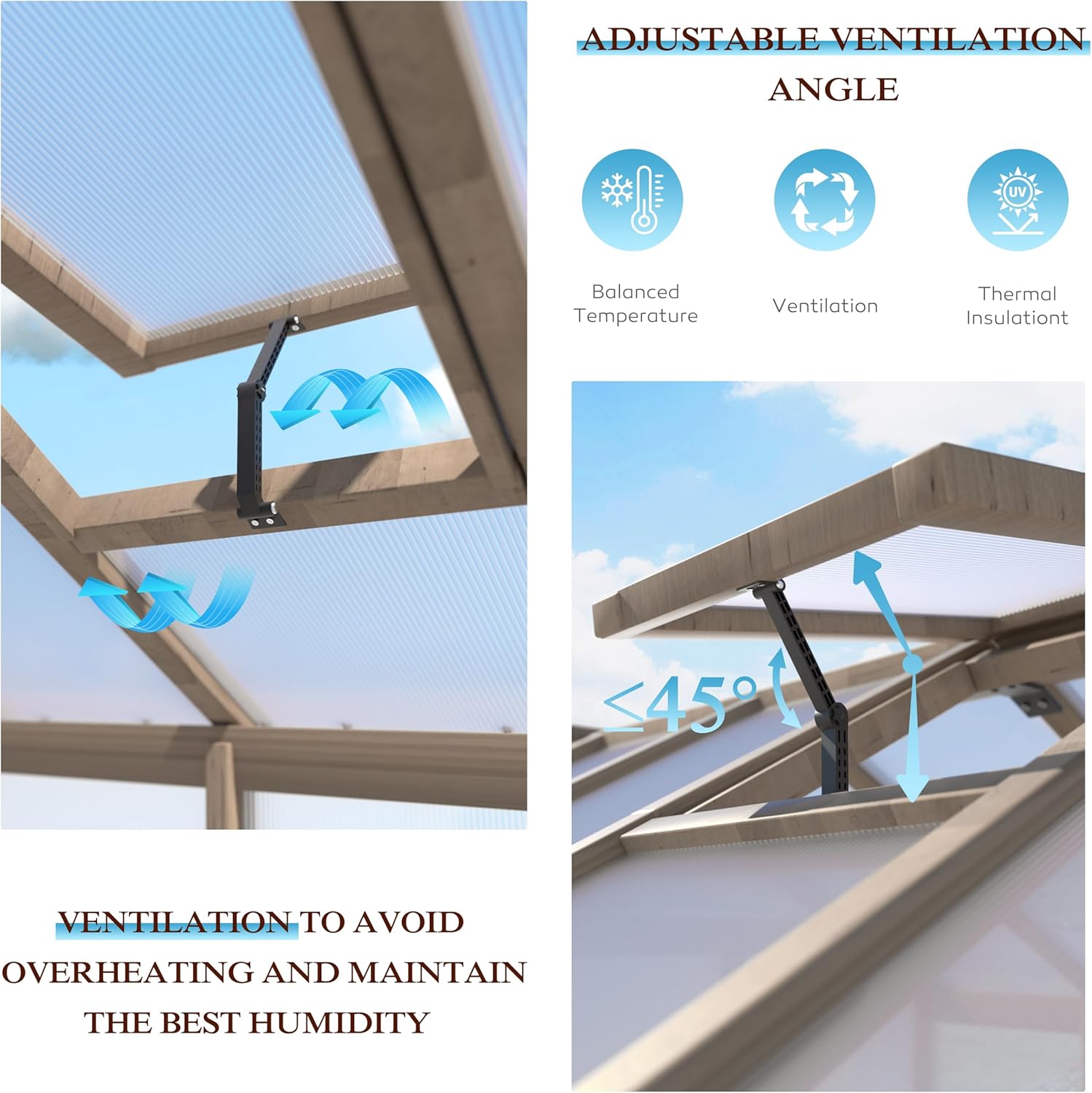 • Adjustable Ventilation - Our greenhouses provide fresh space for your plants and promote optimal plant growth through Windows with adjustable opening angles. Vents located at the top allow you to regulate airflow and maintain the ideal interior environment of the greenhouse, providing a healthy ventilation system and balanced temperature for your plants in different seasons.